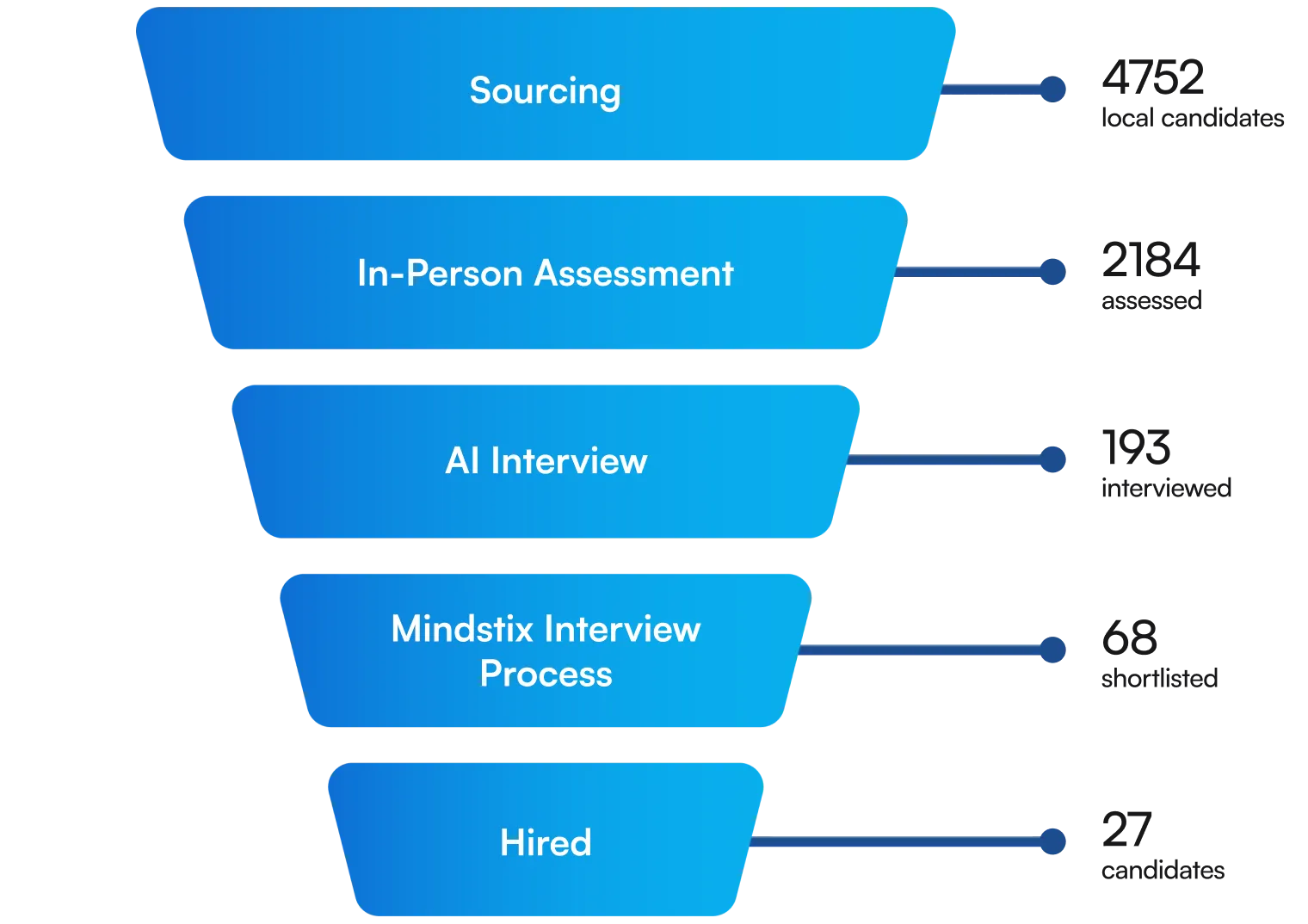 End-to-end process: sourcing, assessments, AI interviews, and final hires.
